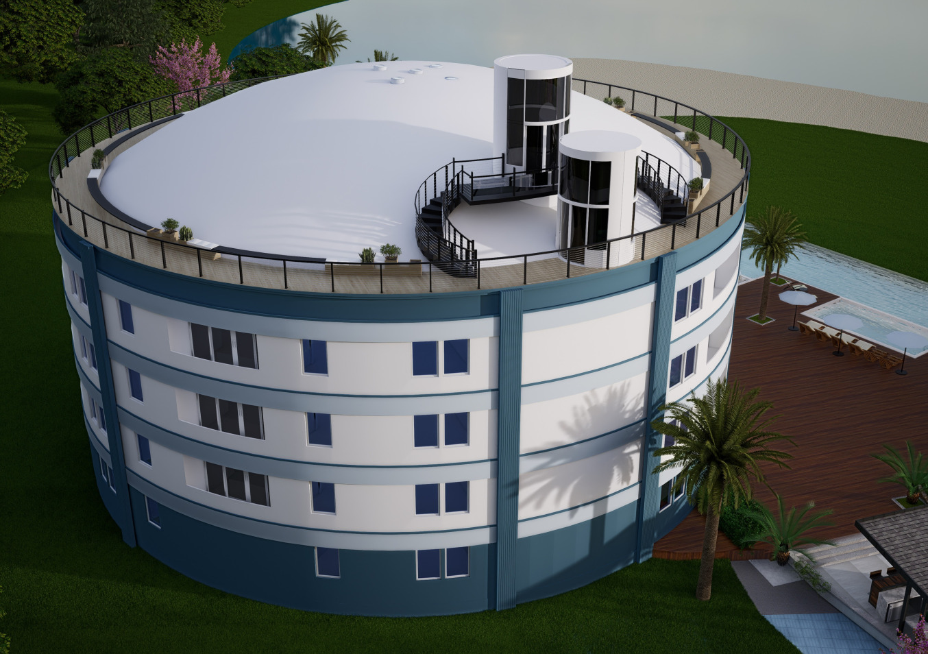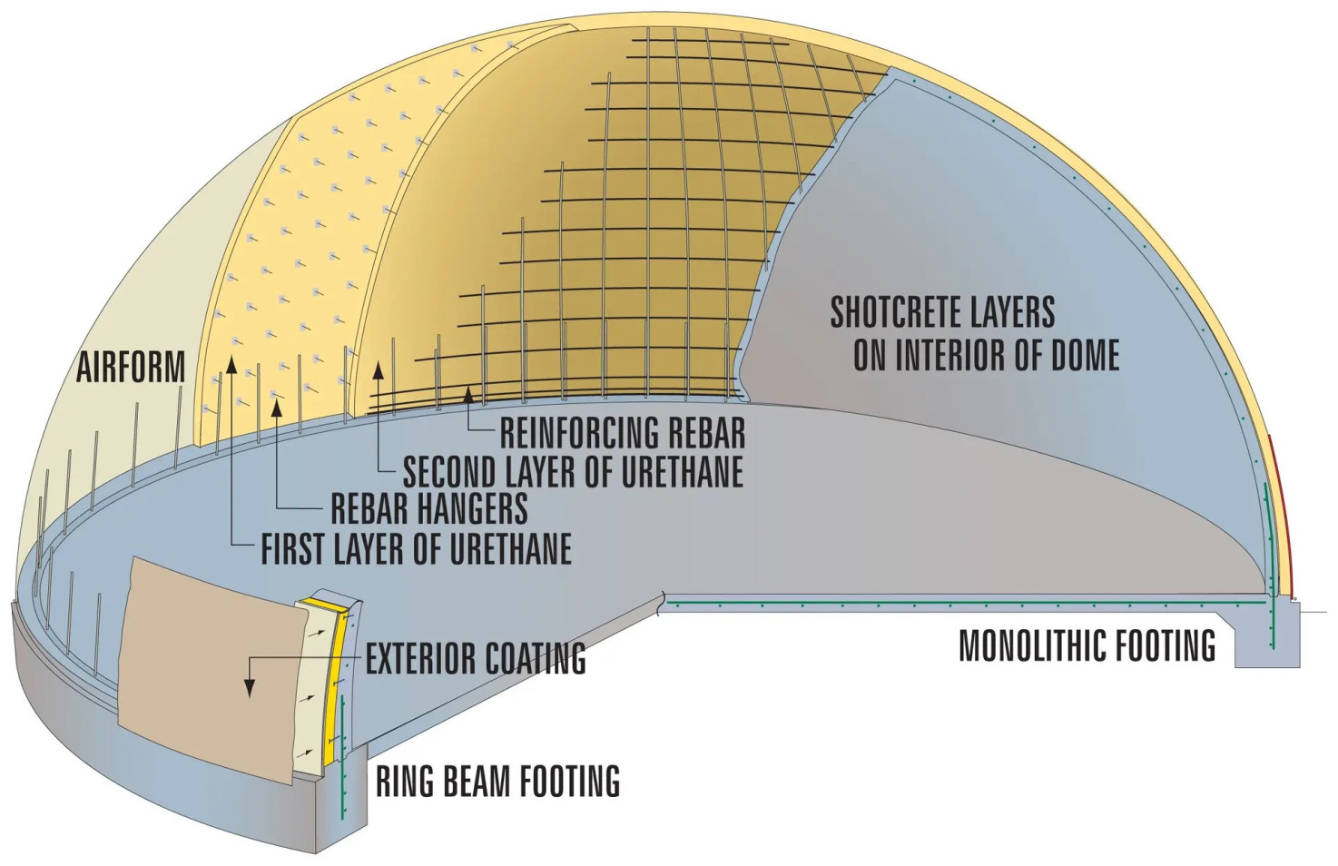 Energy Efficiency of Monolithic Dome Technology is at least 50% greater than standard buildings. Such extreme energy efficiency is expected in Green Dome Living’s flagship design based on past performance of Monolithic Dome Technology. The reason is minimal seams in a tight building envelope with superior insulation (about 3 inches of polyurethane spray foam) and substantial thermal mass (about 6 inches of concrete).